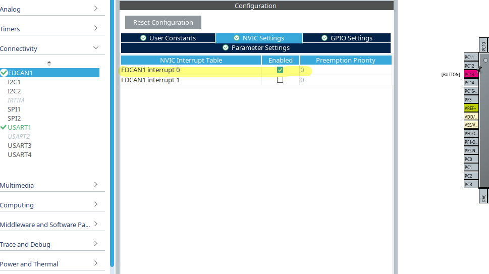 But then I though: “Let’s explore the UI of STM32CubeMX a bit more. And behold: There’s an interrupt tab called “NVIC Settings” that escaped my view before and FDCAN1 interrupt 0 is not enabled. Let’s change that like so: